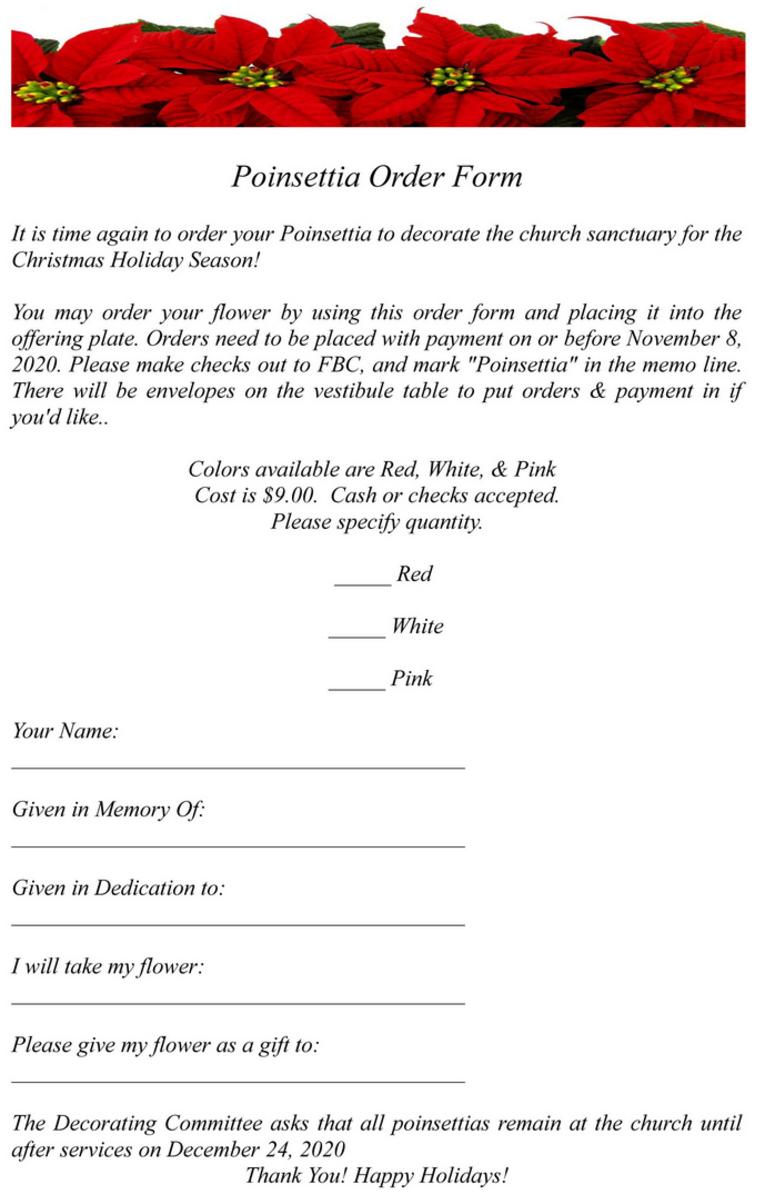 Please contact the church office by email or phone if you wish to order poinsettia's on or before November 8th, 2020.